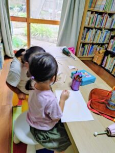 写真はお絵かきをしながら、おやつをいただいているところ。